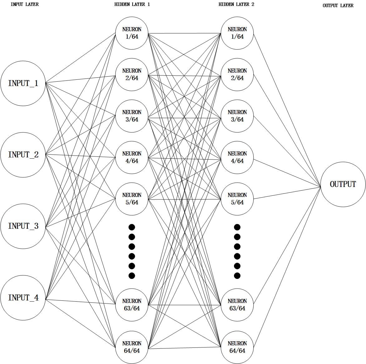 - Hidden Layers: Two dense layers with 64 neurons each and ReLU activation functions to capture complex patterns in the data.