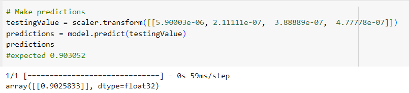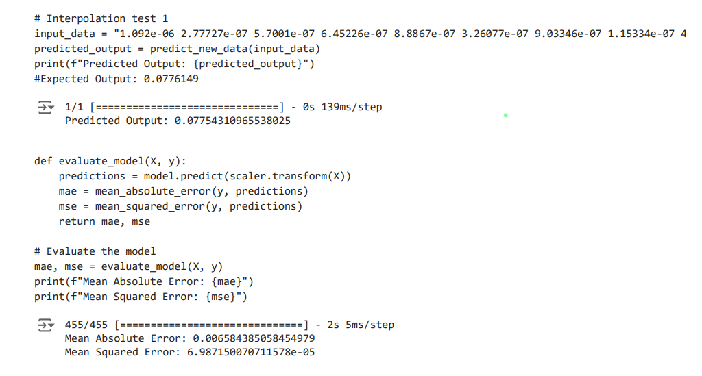 Additionally, the model's prediction accuracy was tested on new input data. For instance, given the input features [5.90003e-06, 2.11111e-07, 3.88889e-07, 4.77778e-07], the model predicted a value of 0.9025833, closely matching the expected value of 0.903052.