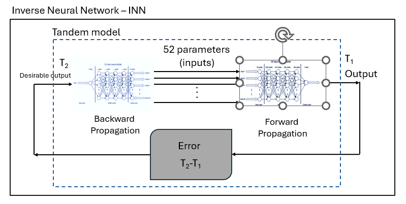 The tandem model was the first one we tried. This model uses iterative methods to create an inverse neural network model. The problem with this model is that it performs poorly with extrapolation data, and extrapolation prediction is essential for our project.