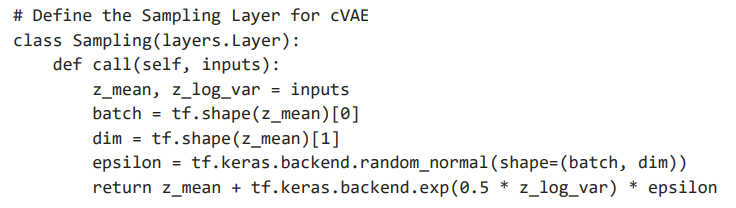 Samplinglayer is defined for the cVAE, which generates random samples from the latent space during training. This is essential for the reparameterization trick used in VAEs.