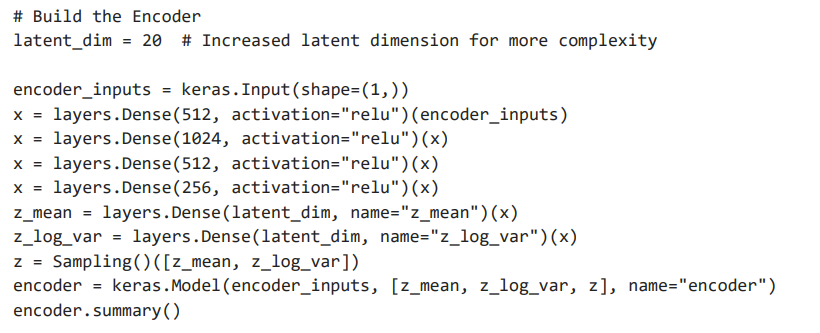 - The encoder outputs the mean and log variance of the latent space, along with the sampled latent vector.
