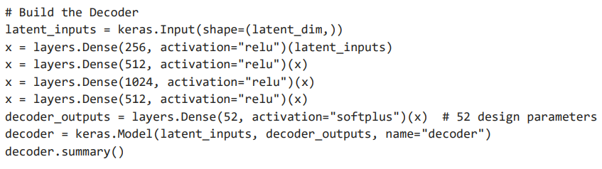 - The decoder takes the latent vector as input and reconstructs the design parameters through multiple dense layers with ReLU activation functions.