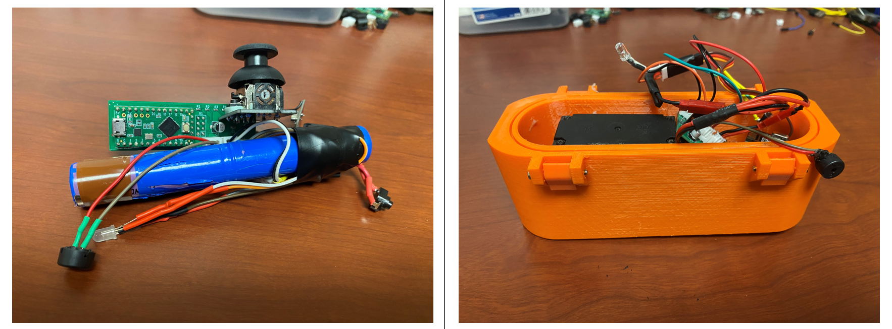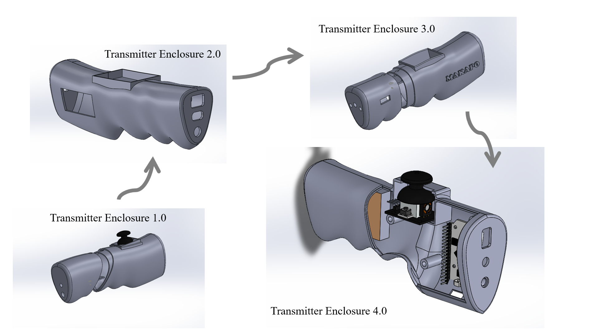 Another of my responsibilities was designing the transmitter enclosures. Over the course of five months, I taught myself SolidWorks and developed versions 1.0 through 4.0, implementing various improvements with each iteration. The current enclosure features a cap and a body connected by screws, capable of housing a joystick, a 7.4V battery, and a control board. Additionally, it allows users to charge the transmitter without removing the control board.